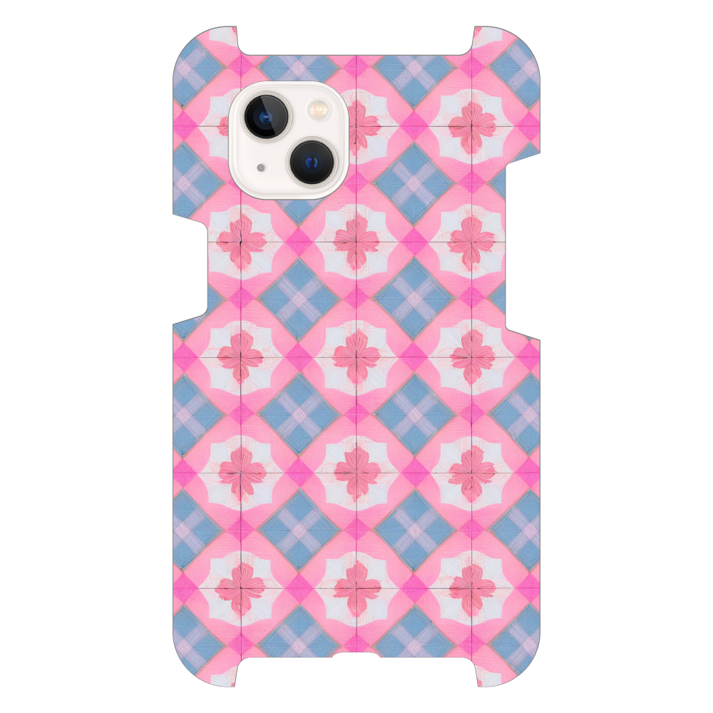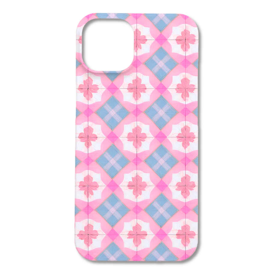 このスマホケースは、エキゾチックなモロッカンタイルを思わせる、幾何学模様と花模様が織りなすデザインです。柔らかなパステルピンクと落ち着いたパステルブルーの組み合わせが、甘すぎず上品な雰囲気を演出します。手描きの線や、ざらりとしたテクスチャ感が、デジタルにはない温かみとクラフト感を加えています