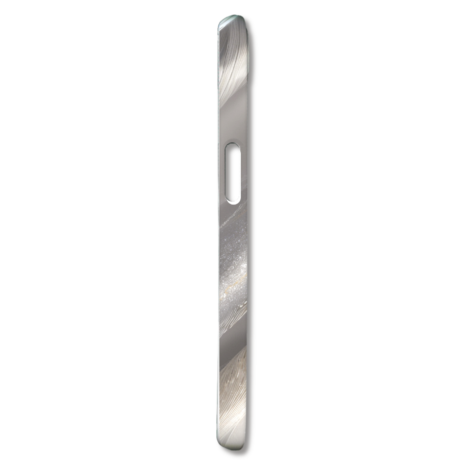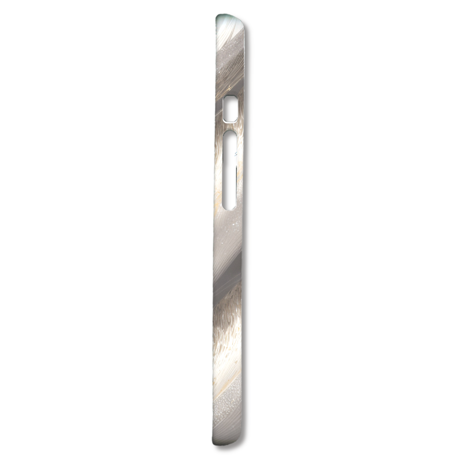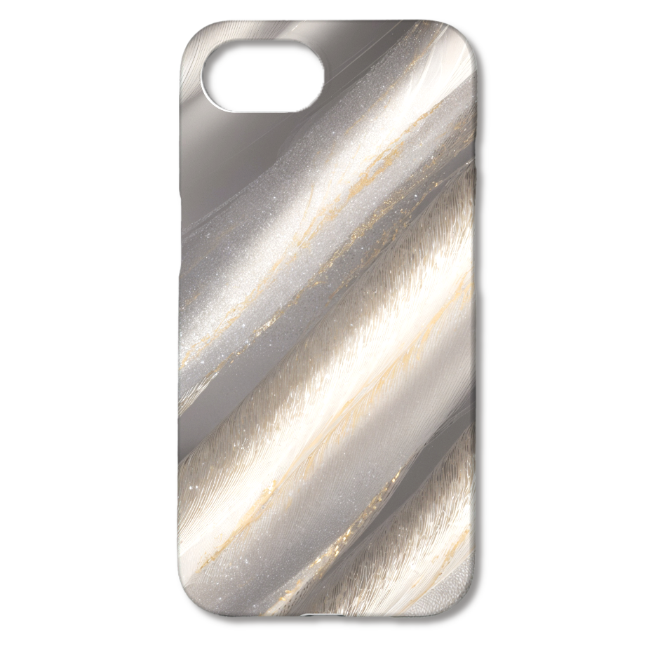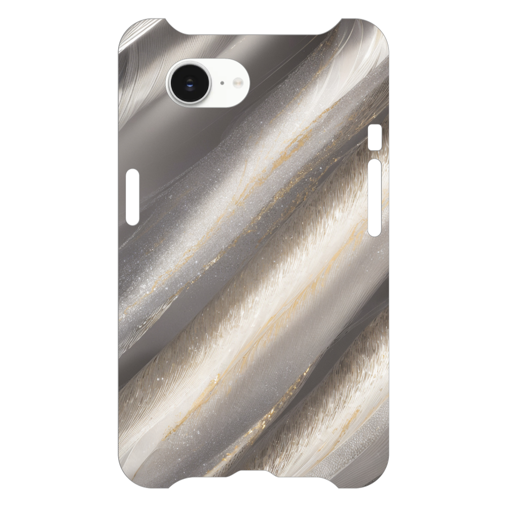 このスマホケースは、光を浴びてきらめく羽毛のテクスチャを抽象的に表現したデザインです。柔らかく繊細な羽毛の質感が、シルバーとゴールドのきらめきによって幻想的な輝きを放ちます。まるで魔法の世界から飛び出してきたような、上品でゴージャスな雰囲気が魅力です。