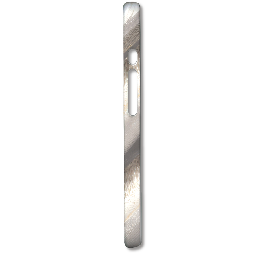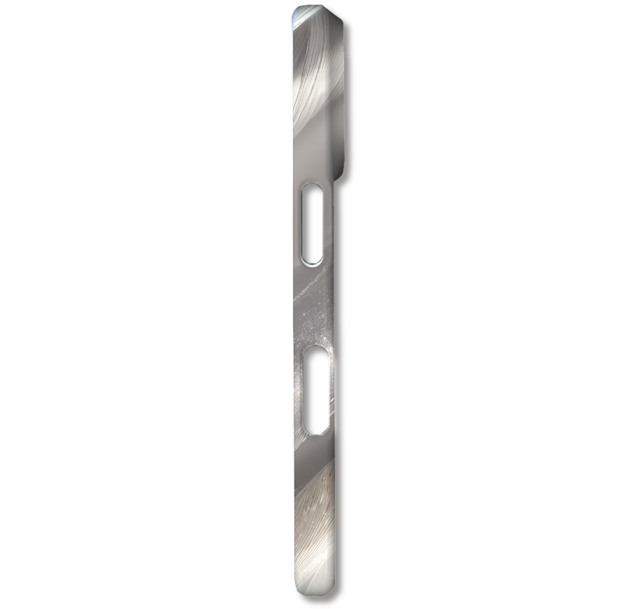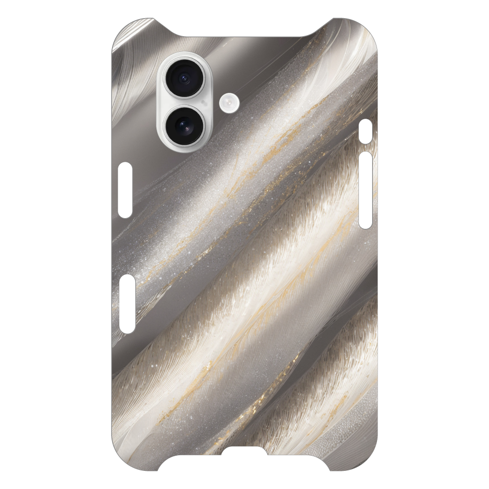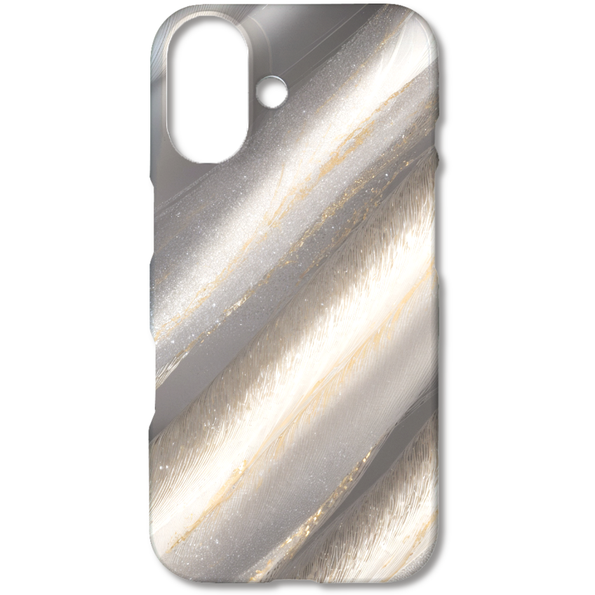 このスマホケースは、光を浴びてきらめく羽毛のテクスチャを抽象的に表現したデザインです。柔らかく繊細な羽毛の質感が、シルバーとゴールドのきらめきによって幻想的な輝きを放ちます。まるで魔法の世界から飛び出してきたような、上品でゴージャスな雰囲気が魅力です。