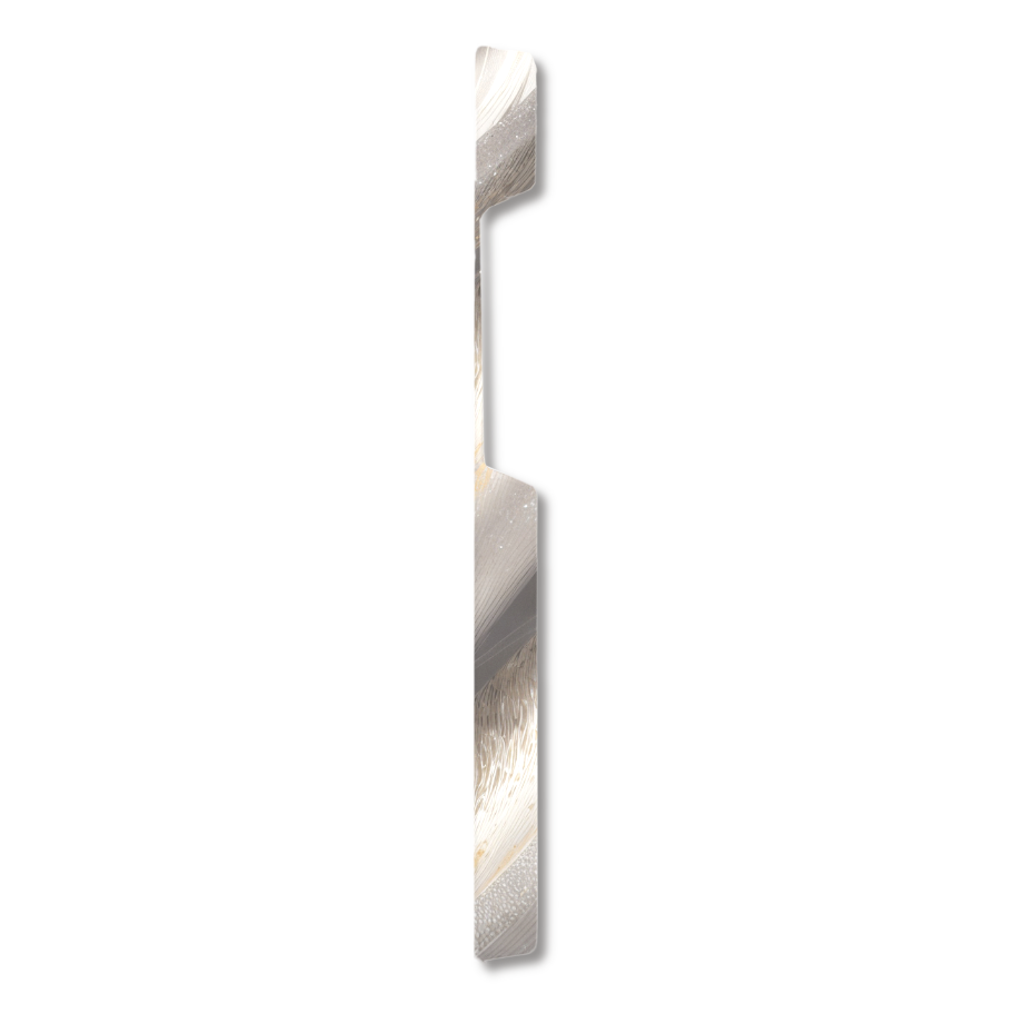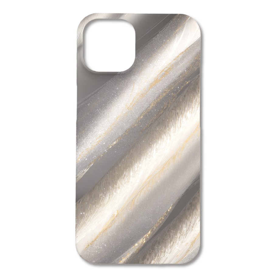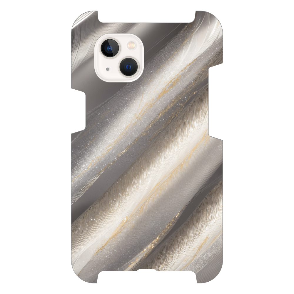 このスマホケースは、光を浴びてきらめく羽毛のテクスチャを抽象的に表現したデザインです。柔らかく繊細な羽毛の質感が、シルバーとゴールドのきらめきによって幻想的な輝きを放ちます。まるで魔法の世界から飛び出してきたような、上品でゴージャスな雰囲気が魅力です。