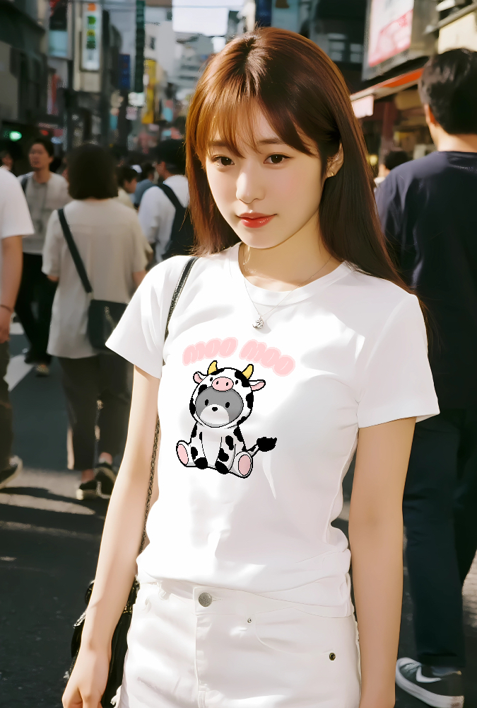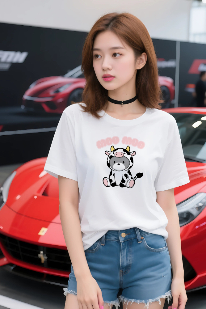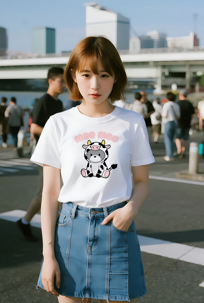 【MOO MOOデザインTシャツ】かわいい牛の着ぐるみキャラクター|ユニーク&癒し系アパレル