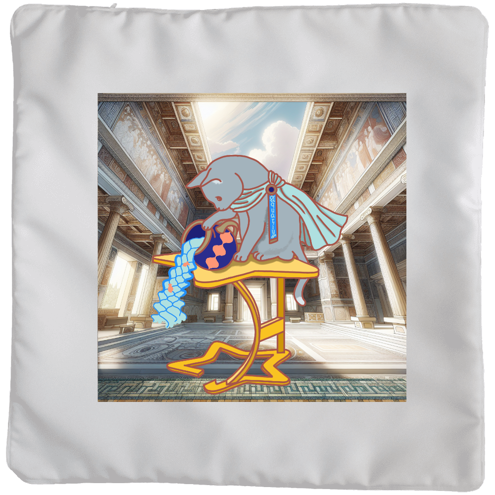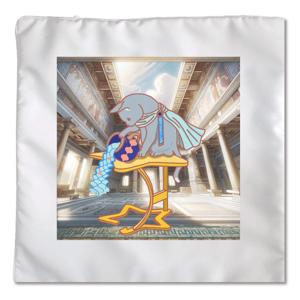 水瓶座に和柄(網目柄)を取り合わせたデザインにしました。水瓶の水や、ネコが倒している瓶に入っている模様が、網目柄になってます。そして、溢れている水の輪郭が、水瓶座のマーク♒になってます。猫の格好がギリシャっぽいので、背景はAIに、ギリシャっぽい室内というテーマで作ってもらいました。