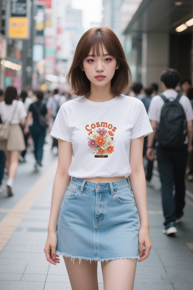 可憐でどこか懐かしい雰囲気を漂わせる「コスモス」の花束デザインを大きくプリントした、1970年代テイストのアパレルが登場しました。オレンジ、ホワイト、パープルといった優しい色合いのコスモスが咲き誇り、自然の美しさとヴィンテージ感を融合させた一枚は、日常のスタイリングを一層華やかに演出します。