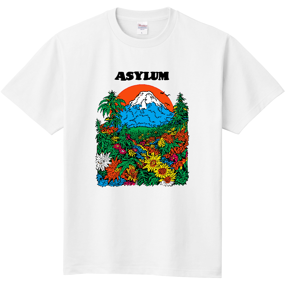 このASYLUMのTシャツは、色彩豊かなフラワーフィールドと雄大な山をモチーフにした、レトロでサイケデリックなグラフィックが特徴です。