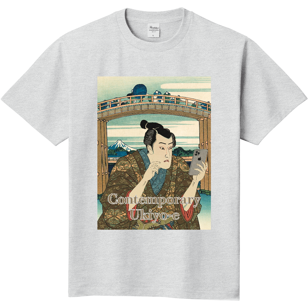 江戸の若き青年が、手にしているのはなんとiPhone!?浮世絵の技法で描かれた現代ガジェットとの融合、それが「現代浮世絵(Contemporary Ukiyo-e)」です!伝統的な美意識と現代カルチャーが奇跡のコラボレーション!着るだけで、周囲の視線を独り占めすること間違いなし!