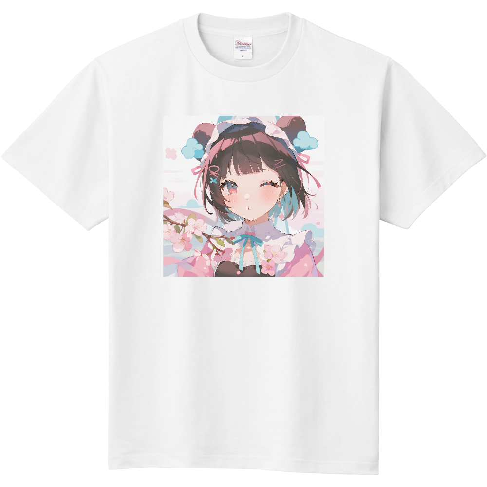 このデザインに描かれているのは、TEEXオリジナルイラストキャラクター「サクラ」。大きな瞳でウィンクをしながら、可憐な笑顔を浮かべています。ふんわりとしたお団子ヘアと、耳元から覗く水色の髪色が、彼女の透明感を引き立てます。頭には、雲の形をしたヘアピンや、かわいらしいリボンがあしらわれ、細部にまでこだわりが詰まったデザインです。