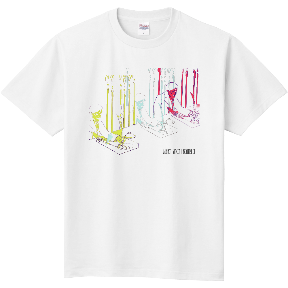 妖しくも美しい線描でアール・ヌーヴォーの時代を象徴した天才イラストレーター、オーブリー・ビアズリー。彼の静謐な執筆姿を、幻想的な色彩とリズムで再構成したアートTシャツ&トートバッグです。