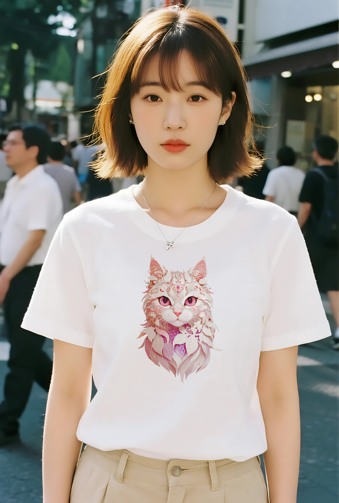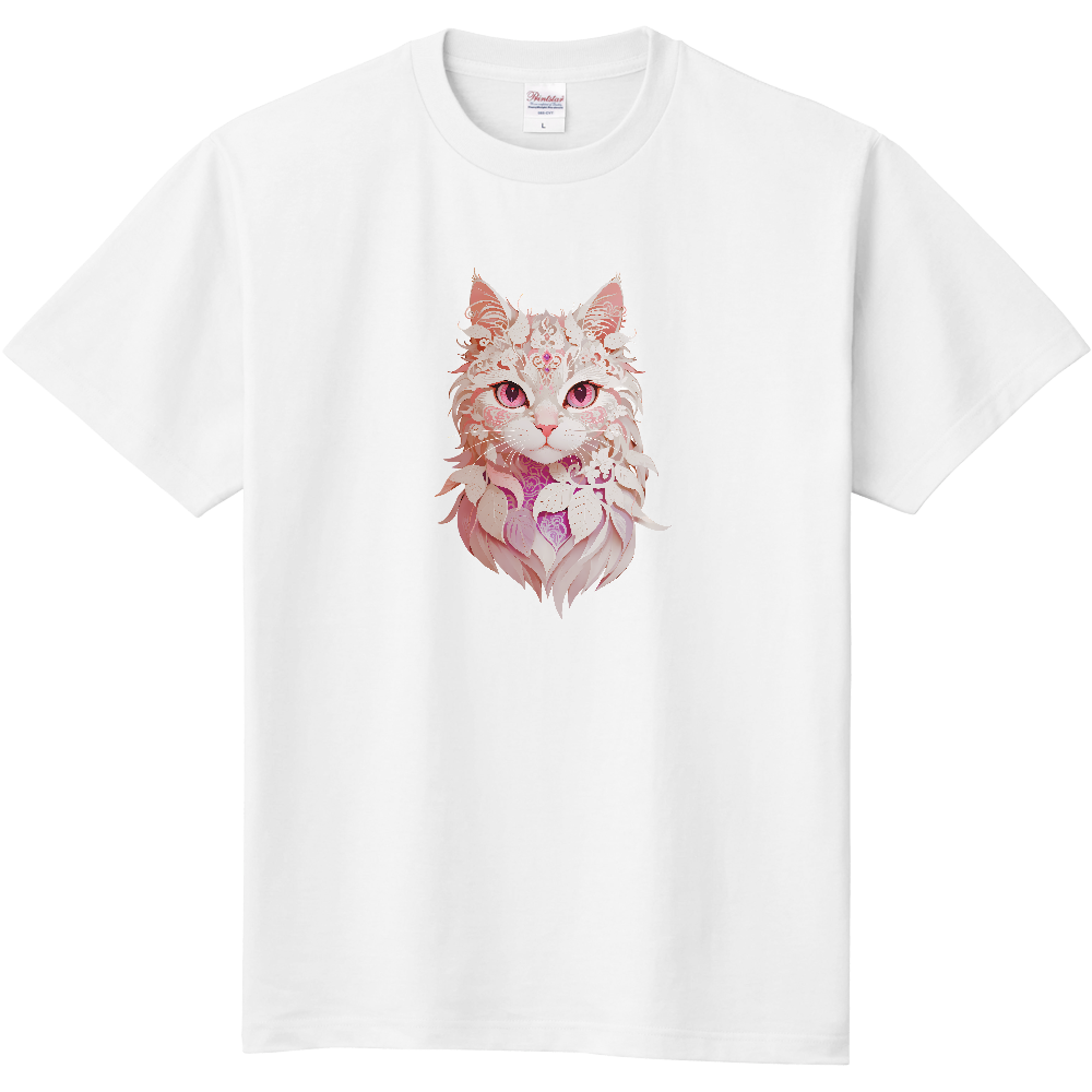 神々しさと優雅さを纏う猫デザインは、白い花や葉と優しいピンクをテーマに、神々しい猫を繊細な切り絵のようなタッチで表現しました。愛らしい猫の顔立ちと、周囲を彩る精緻な植物の装飾が、見る人に幻想的な美しさと神秘的な力を感じさせます。
