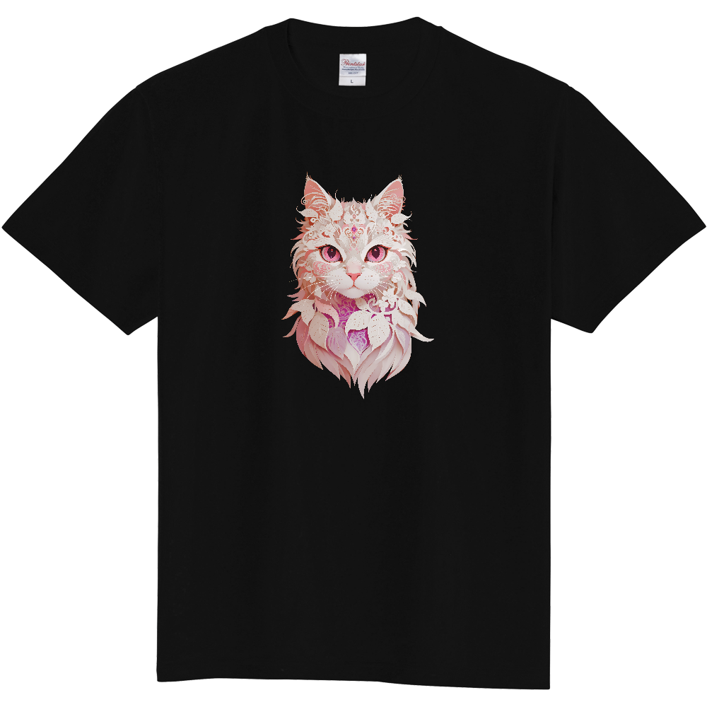 神々しさと優雅さを纏う猫デザインは、白い花や葉と優しいピンクをテーマに、神々しい猫を繊細な切り絵のようなタッチで表現しました。愛らしい猫の顔立ちと、周囲を彩る精緻な植物の装飾が、見る人に幻想的な美しさと神秘的な力を感じさせます。
