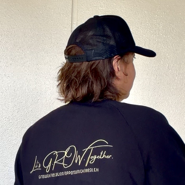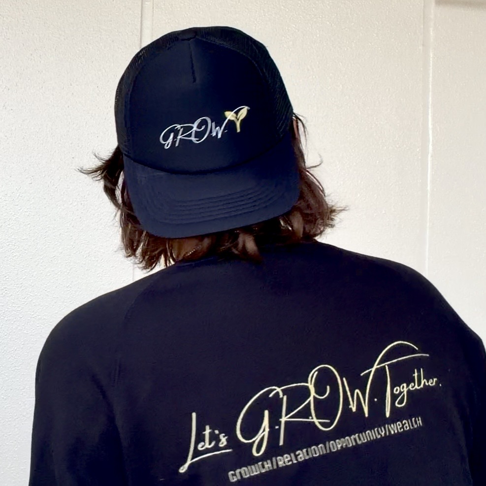 正面にG.R.O.W.(筆記体)ロゴと新芽をイメージしたゴールドのワンポイントがあしらわれています。