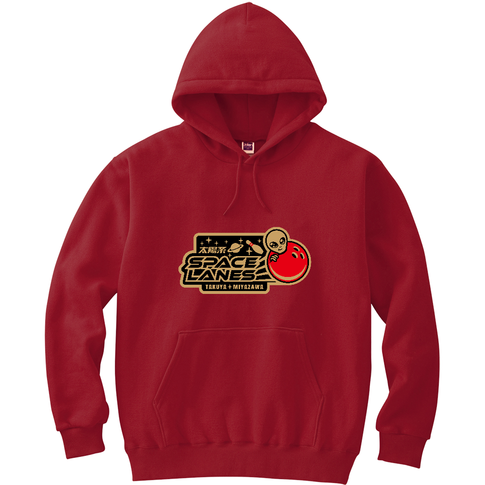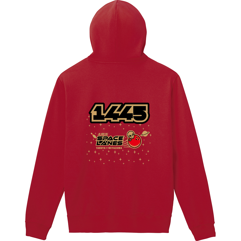 背面の宇宙空間にライセンスナンバーを、前面には太陽系スペースレーンズのワッペンロゴを大きく入れたプルオーバー。気軽に着れる一枚です。