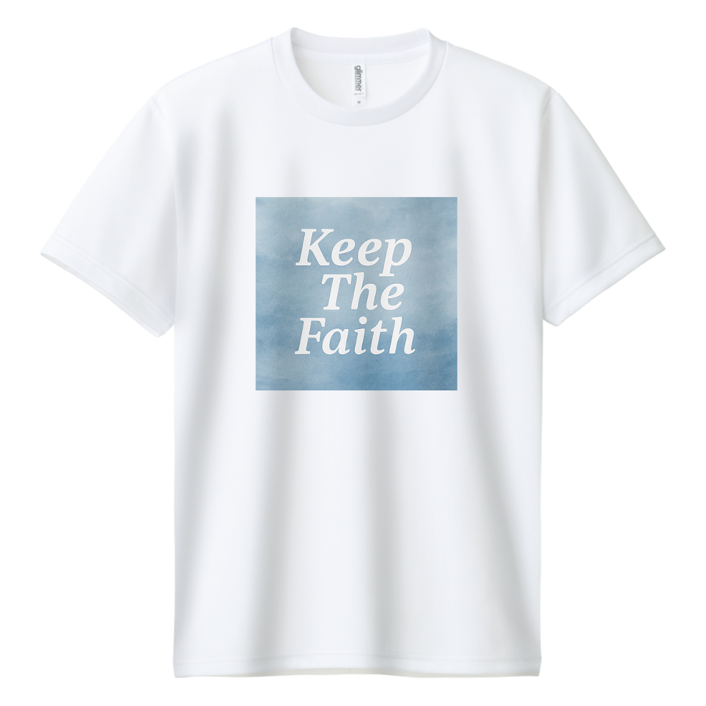 淡いブルーグラデーションの中に「Keep The Faith」という言葉をデザイン。