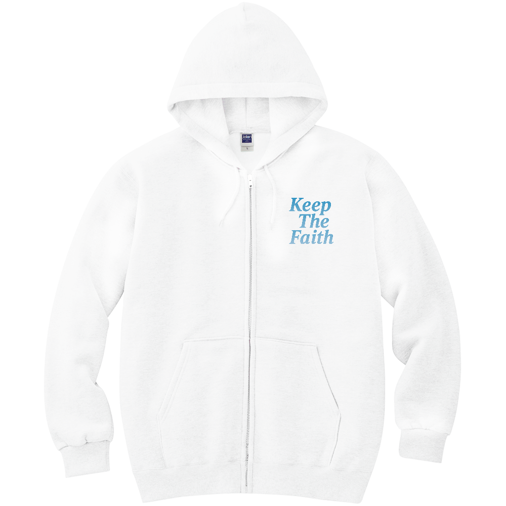 胸元にブランドメッセージ「Keep The Faith」をシンプルにデザインしたジップアップパーカー。