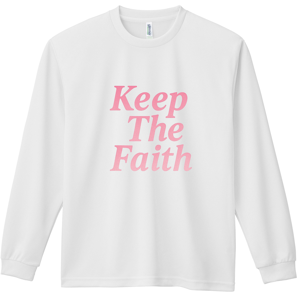 淡いピンクの“Keep The Faith”ロゴを胸に、シンプルながらも温かみのあるロングスリーブTシャツ。