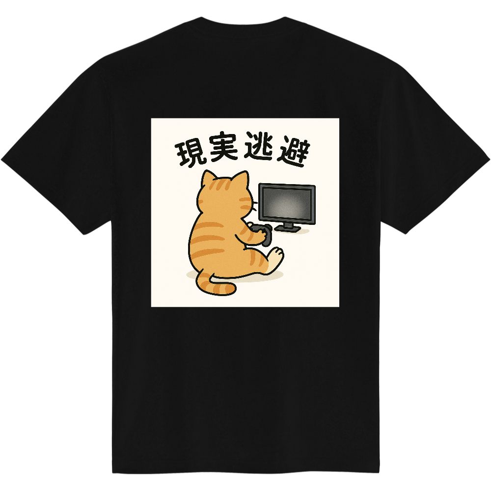 ゲームに夢中な後ろ姿の猫がかわいすぎる、「現実逃避」デザインのTシャツです。