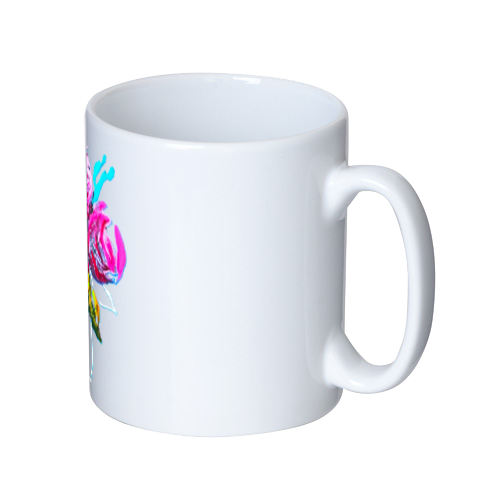 転写紙にインクをプリントし高温の熱をかけることで、インクを気化させマグカップに浸透させる加工方法です。マグカップに直接浸透させることで、表面には印刷した違和感(凸凹)が全く残りません。