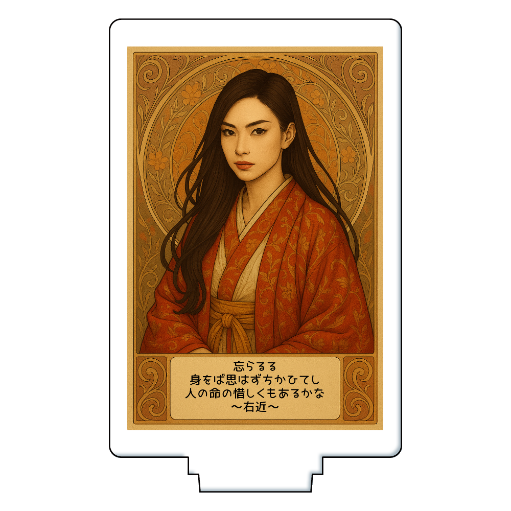 恋の哀しみをたおやかに詠んだ彼女を、ミュシャ風の繊細な曲線と花の装飾で描いたアクリルフィギュアです。