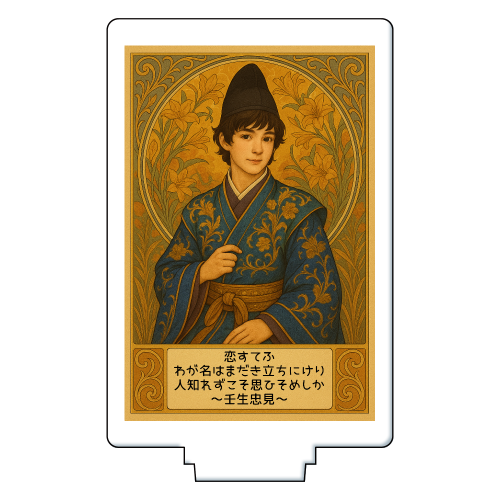 恋の噂が広まる切なさを詠んだ歌人を、ミュシャ風の華やかな装飾と光のグラデーションで描いたアクリルフィギュアです。