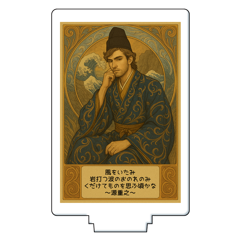 激しくぶつかる波に自らの想いを重ねた歌人を、ミュシャ風の荘厳な構図で描いたアクリルフィギュアです。