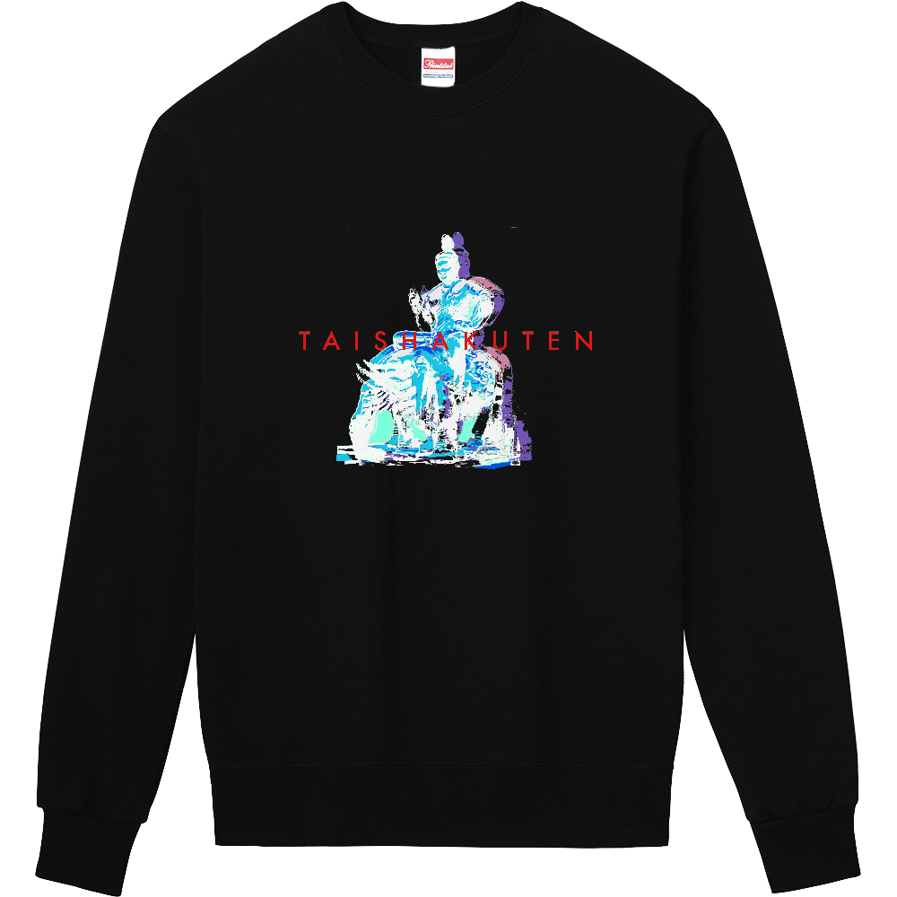 グリッチ加工された帝釈天像と、燃えるような赤文字がインパクトを放つ一着。