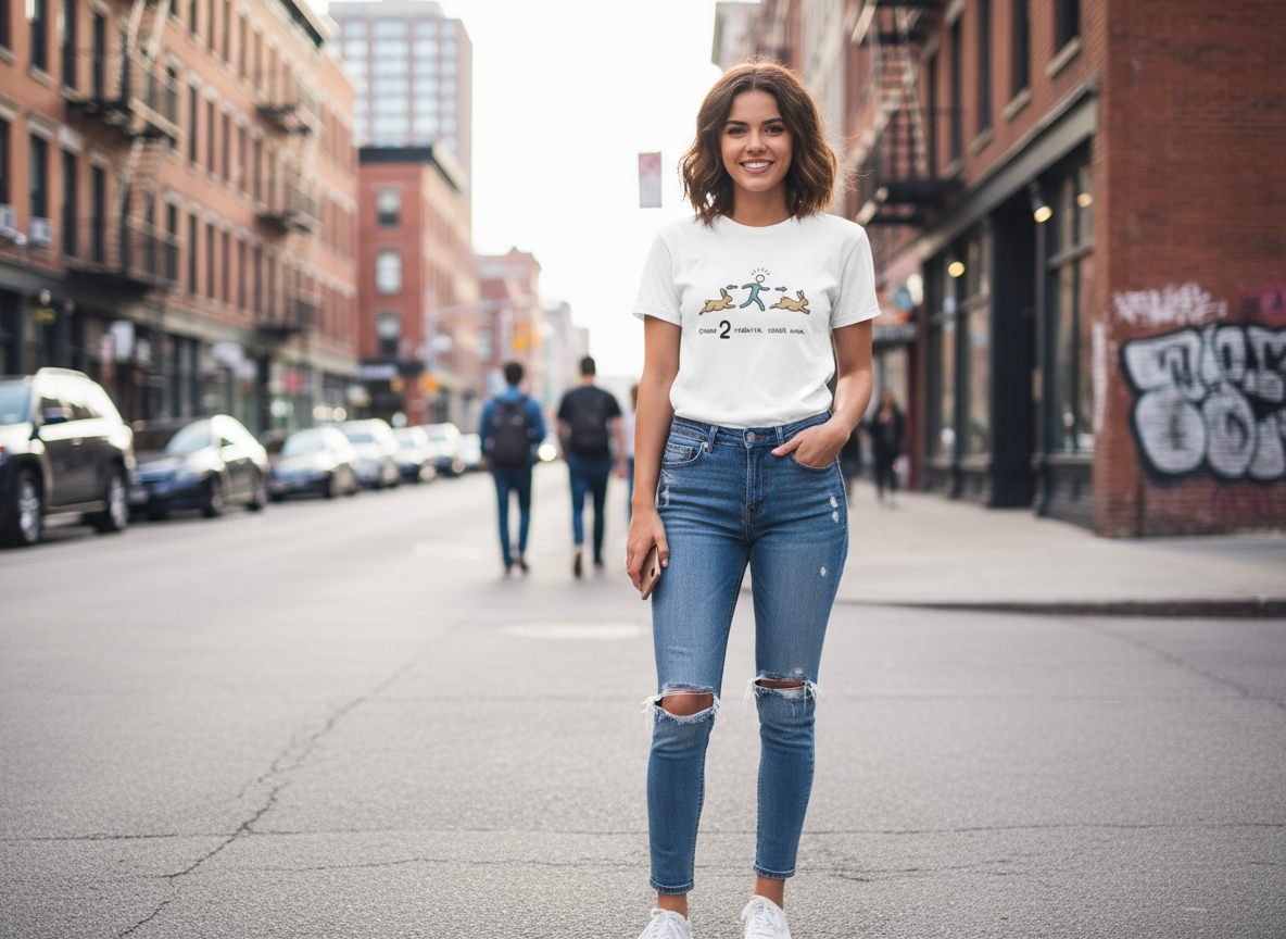 「二兎を追う者は一兎をも得ず(Chase two rabbits, catch none)」をシンプルなイラストで表現しました。