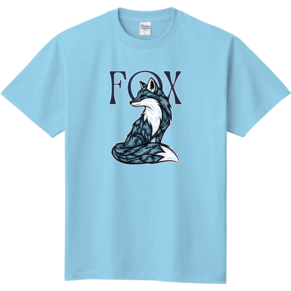 深いブルーと白を基調とした色使いが特徴のキツネ(FOX)デザインです。キツネの体には、まるで氷や雪の結晶、あるいは繊細な葉のパターンを織り込んだような神秘的な模様が描かれており、視線を引きつけます。背景に円状に配置された「FOX」の文字が、デザイン全体にタトゥーやトライバルアートのようなクールでストリートな雰囲気を加えています。