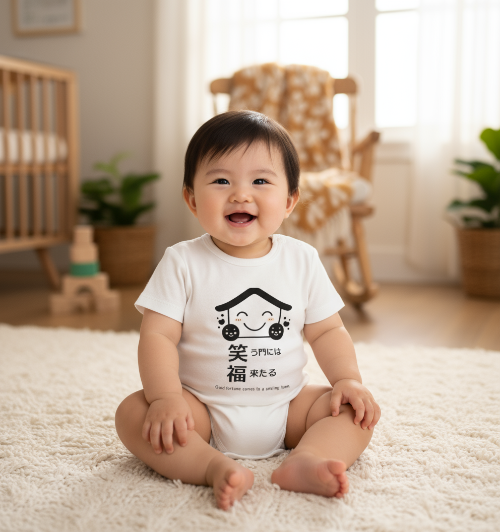 「笑う門には福来る(Good fortune comes to a smiling home)」をベビーロンパースにデザインしました。これを着る子たちに福が来ることを祈ってデザインしました。
