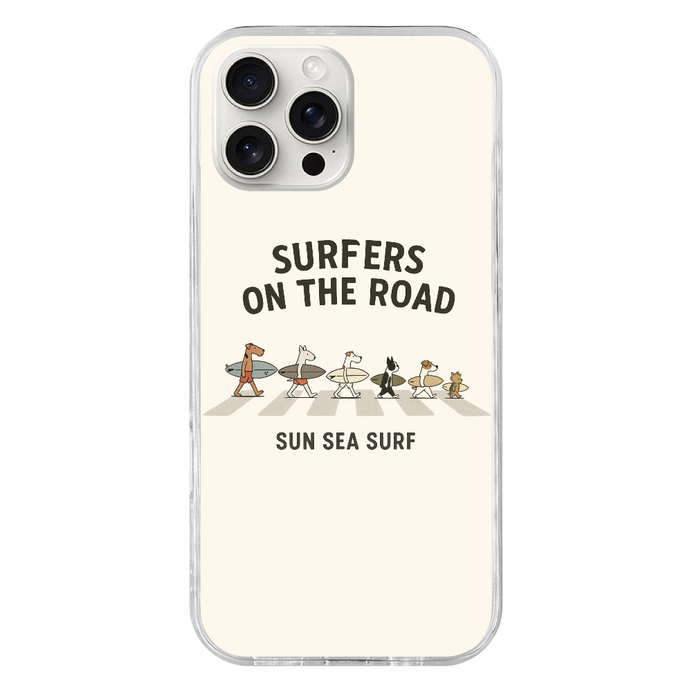 サーフボードを抱えたテリアたちが横断歩道を行進するユニークなデザイン