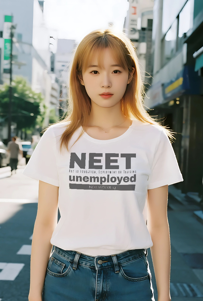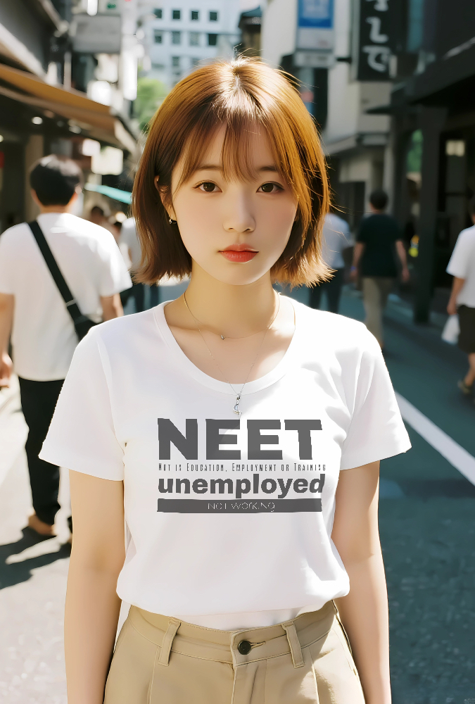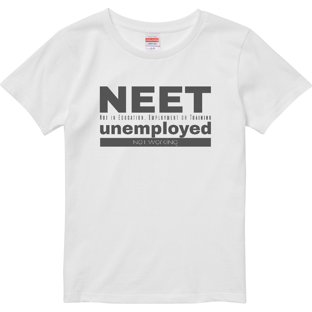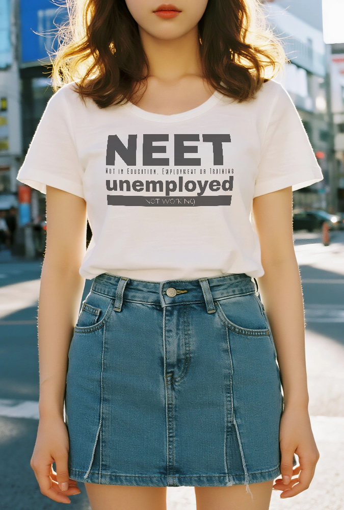 教育(Education)、雇用(Employment)、訓練(Training)のいずれにも属さない状態を示す国際的な定義**「NEET」**。このTシャツは、その定義をグラフィカルに、そして大胆に表現しています。