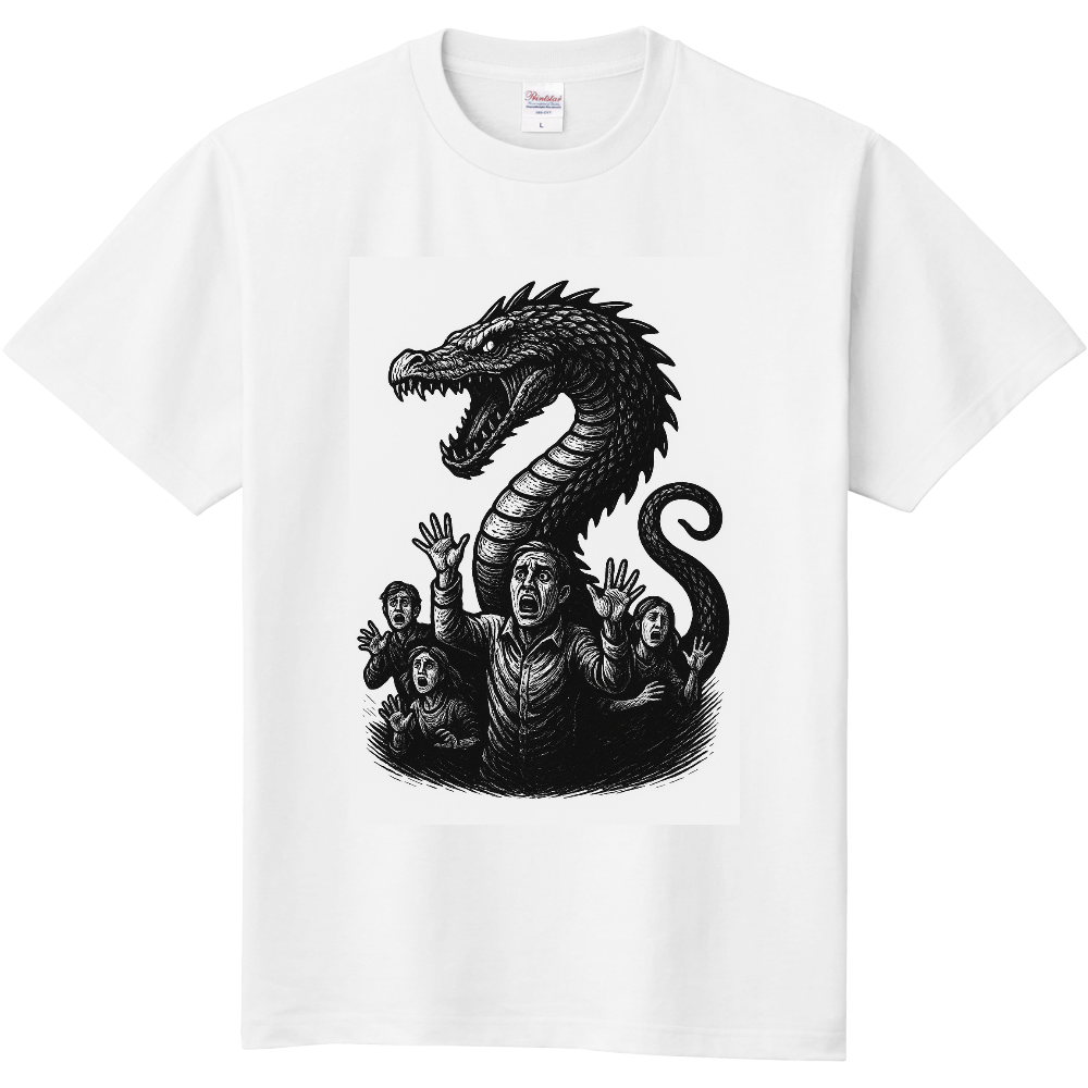 架空の巨大生物に襲われる人々を描いたデザインです。