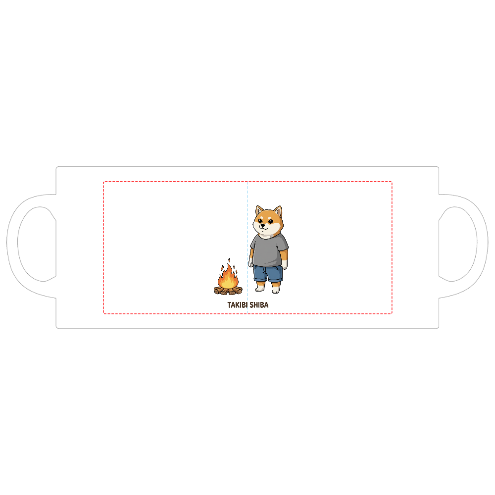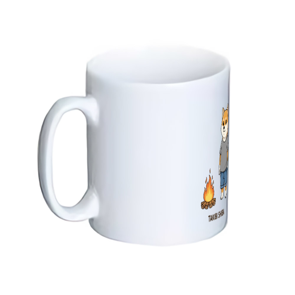 温かい飲み物を片手に、TAKIBI SHIBAくんと「ほっこり」ブレイクタイム。焚き火のそばで佇む普段着姿のTAKIBI SHIBAくんをデザインした、白い磁器製のマグカップです。
