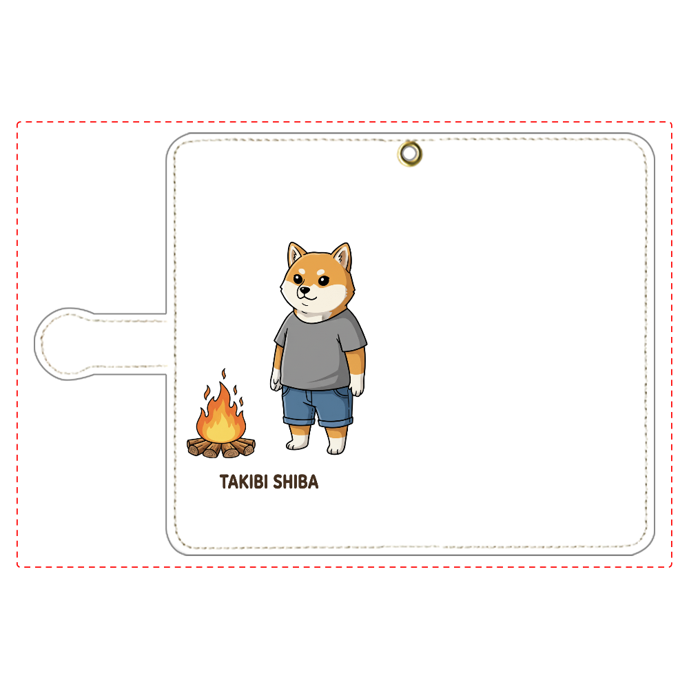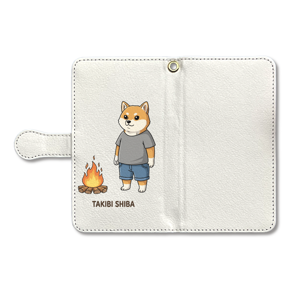 あなたのスマホも「ゆるい時間」に包まれます。焚き火のそばで佇む普段着姿のTAKIBI SHIBAくんをデザインした、手帳型のアンドロイド用スマートフォンケースです。
