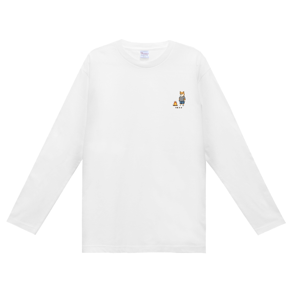 我らがブランドアイコン、普段着のTAKIBI SHIBAくんが、焚き火のそばでゆる〜く佇む姿を胸元にプリントしました。この愛らしいデザインが、あなたの長袖Tシャツ姿にユーモアと癒やしを添えます。