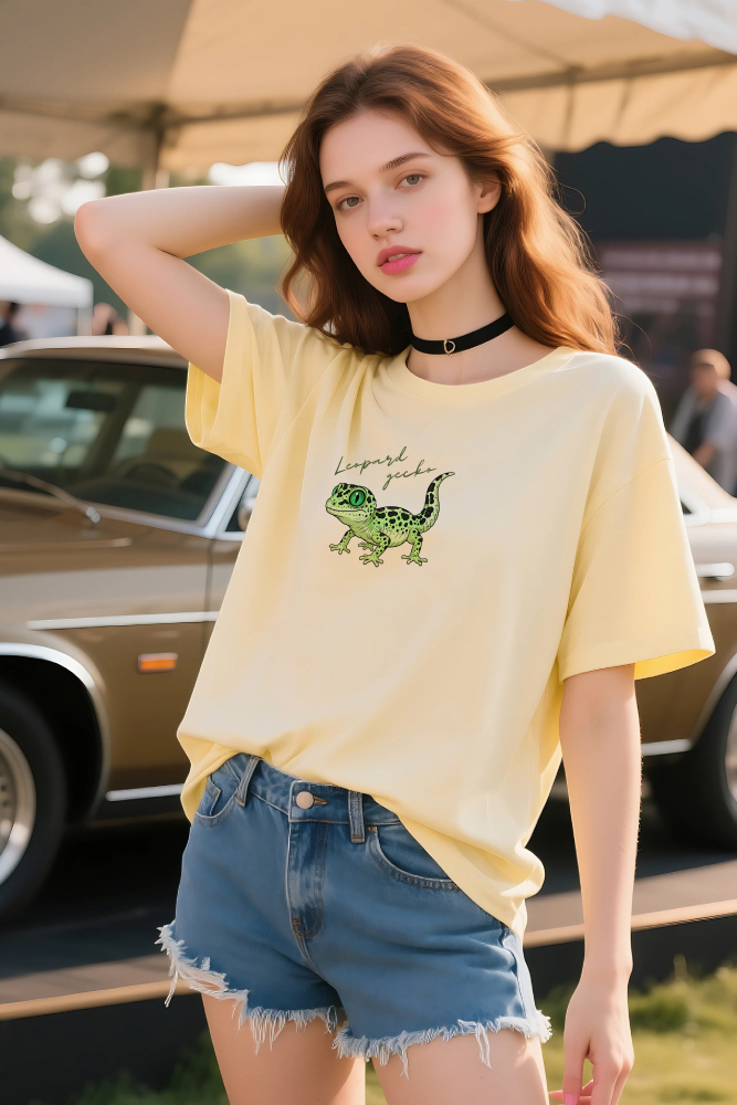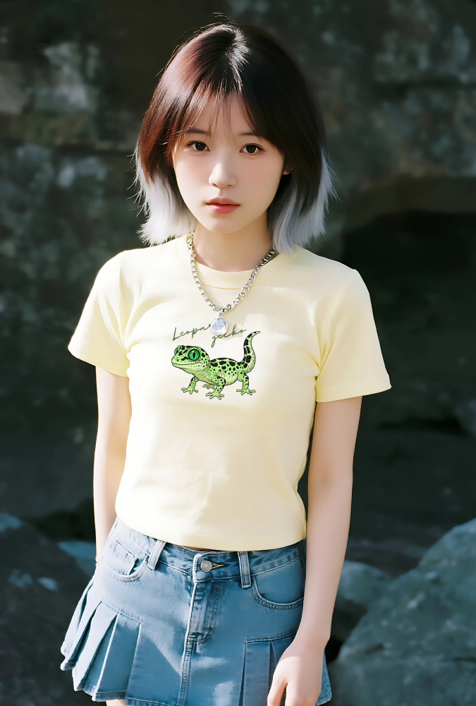 このデザインは、レオパードゲッコーの魅力を最大限に引き出すために、鮮やかなライムグリーンと、特徴的な黒いスポット模様を強調して描かれています。まるで宝石のようなエメラルドグリーンの瞳は、見る人を惹きつけるクールなアクセントに。単なるペットイラストではなく、ファッションアイテムとして成立するよう、デザイン性に徹底的にこだわりました。