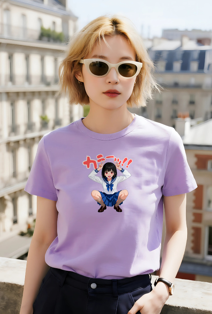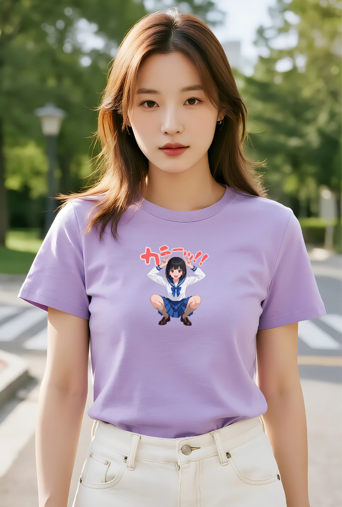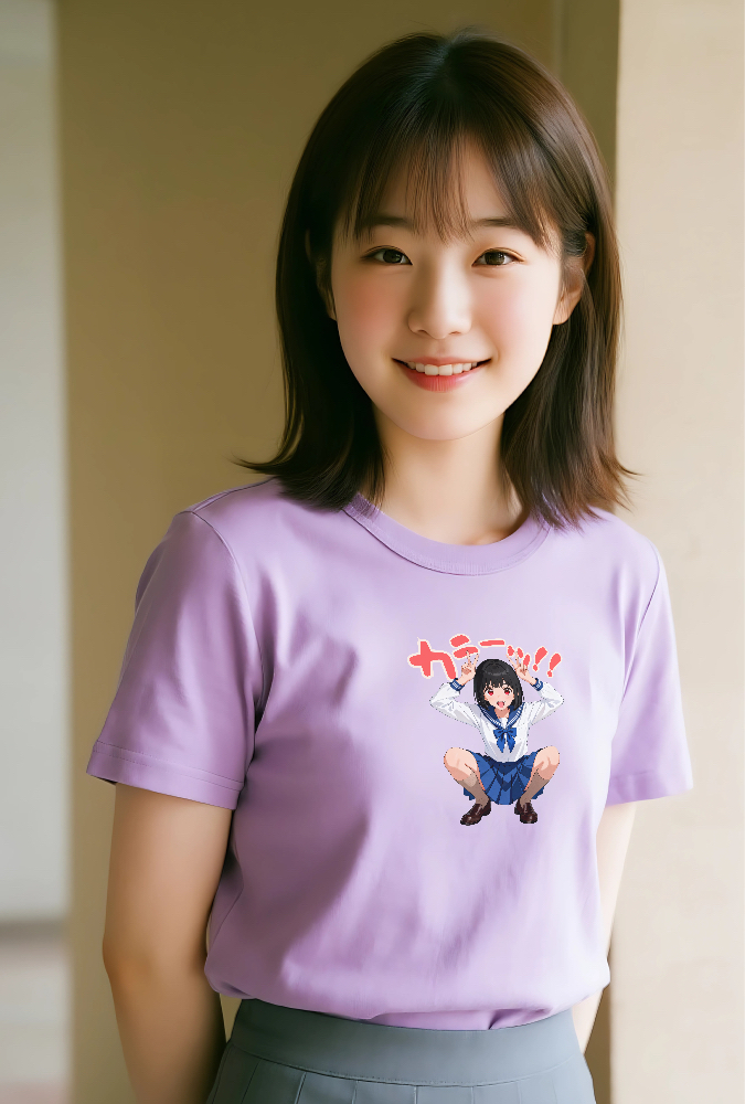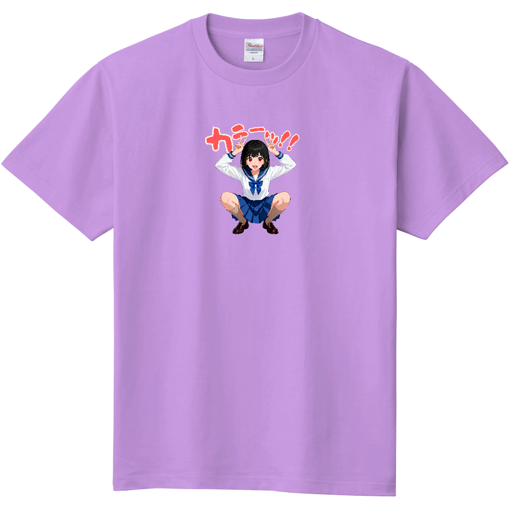このイラストは、「カニーッ!!」と叫びながら蟹(かに)に擬態する、オリジナリティ溢れるスクールガールを大胆にプリント。ピースサインがカニのハサミを表現し、しゃがみ込むポーズが甲殻類特有のコミカルな動きを連想させます。