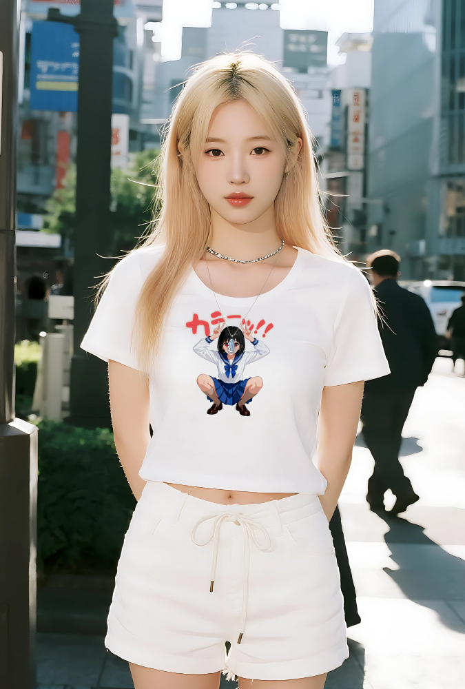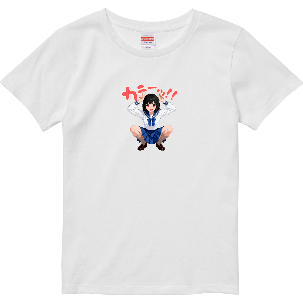 このイラストは、「カニーッ!!」と叫びながら蟹(かに)に擬態する、オリジナリティ溢れるスクールガールを大胆にプリント。ピースサインがカニのハサミを表現し、しゃがみ込むポーズが甲殻類特有のコミカルな動きを連想させます。