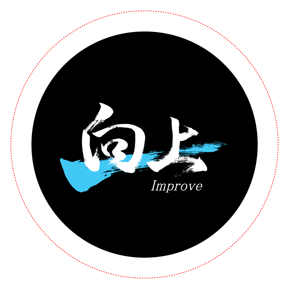 「向上」のオリジナル筆文字缶バッジです。
