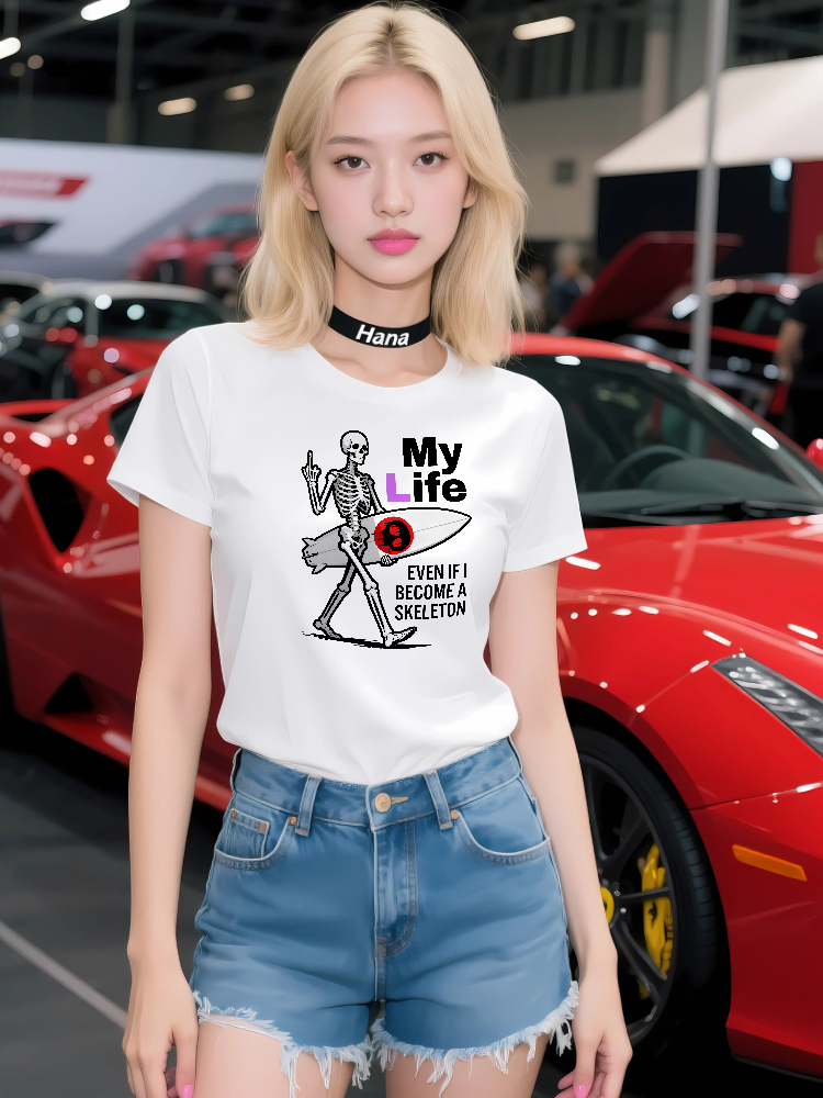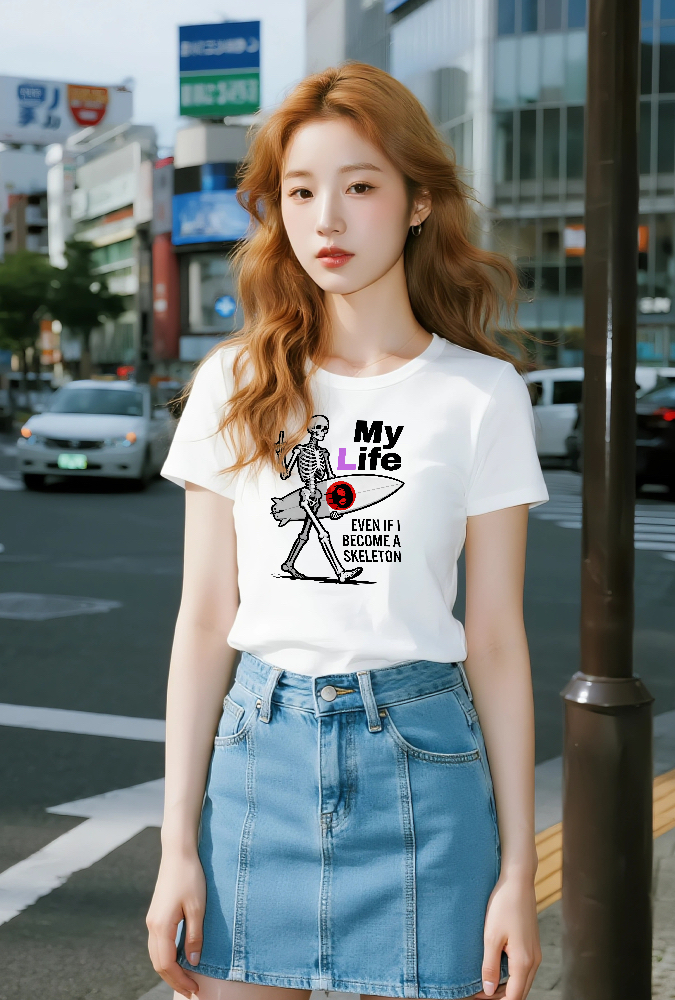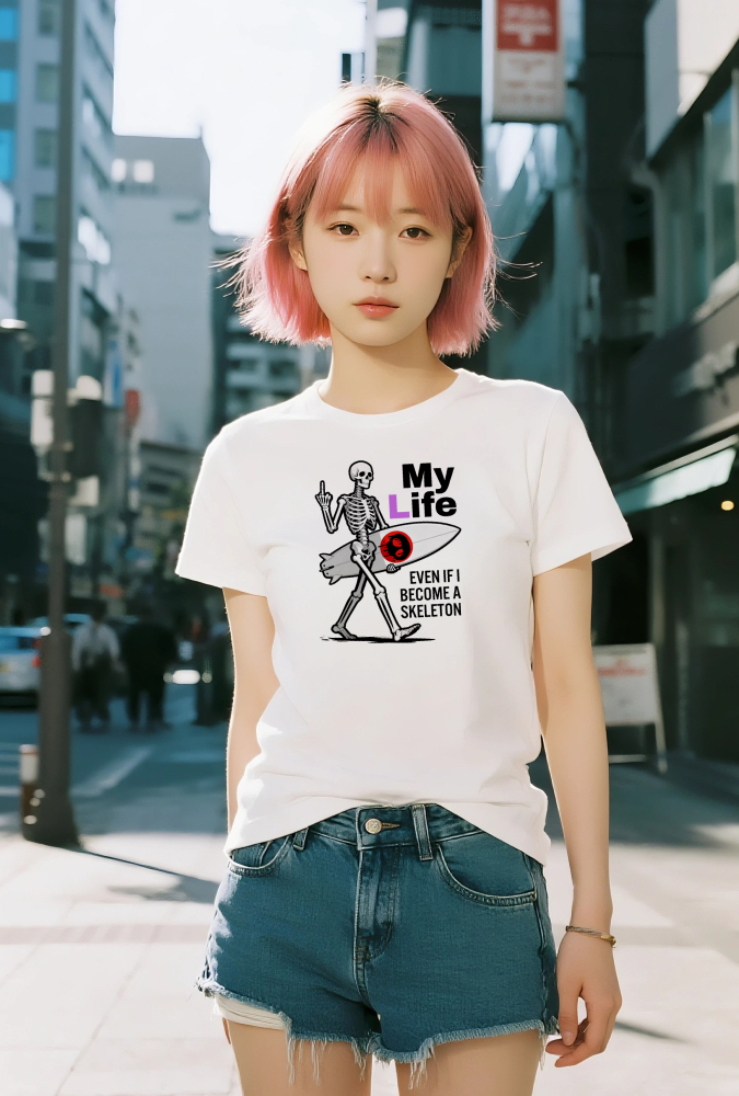 【My Life】スケルトンサーファーとロックな生き様Tシャツ | EVEN IF I BECOME A SKELETON | ユーモア・ストリート・サーフ系デザイン