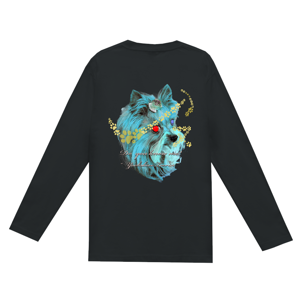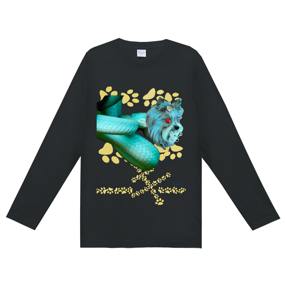 みなさまのご好評に応え ヨーキースネークのカジュアル生地版のBell Sports。Bell Sportsにちなんだバックプリントには「いぬ(ヌ)」のロゴ、正面はよ~く見ると足跡で「ヨーキー」の文字が!普段使いの長袖Tシャツにて新登場。当然、ヨーキーの目は今回も不気味に赤と青に光ってます。