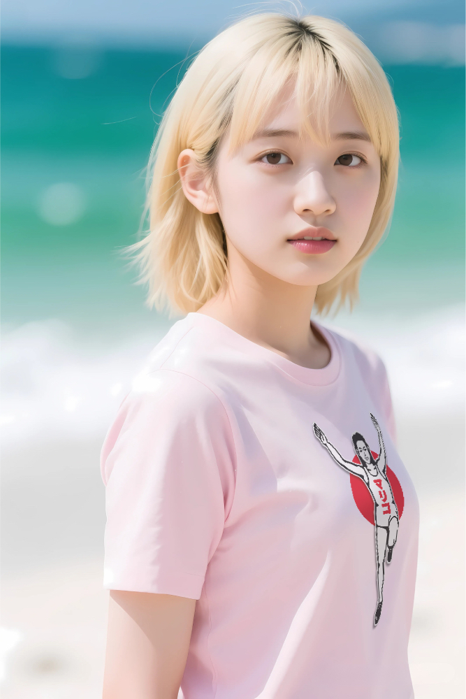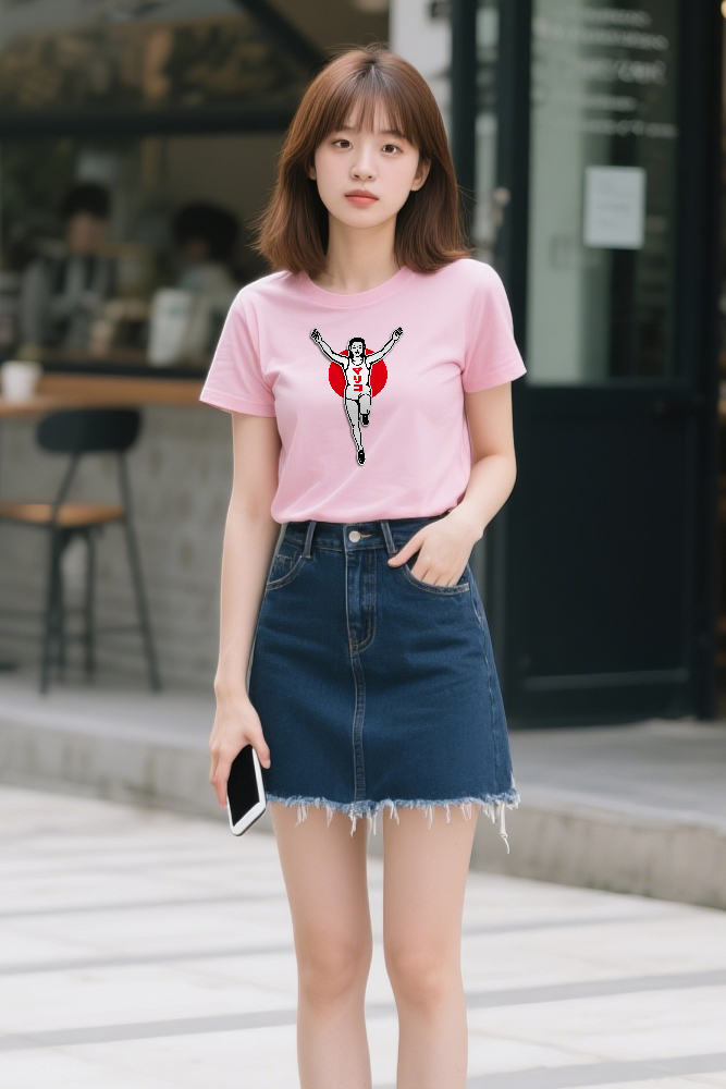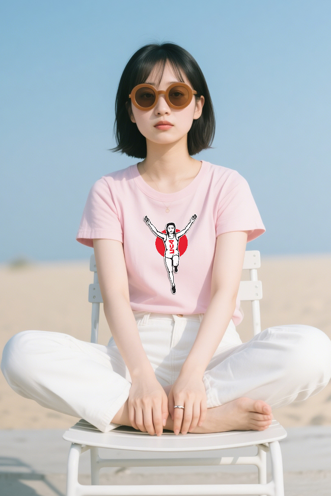 日の丸を背に、力強くゴールを目指す女性ランナー「マリコ」のイラストを大胆にプリントしました。このデザインは、懐かしさを感じさせる昭和レトロなタッチと、力強いアスリートの情熱を融合させたスポーツアートです。