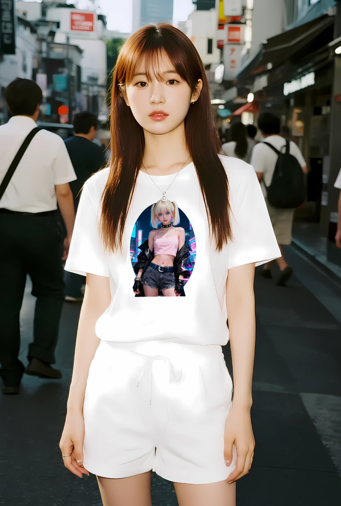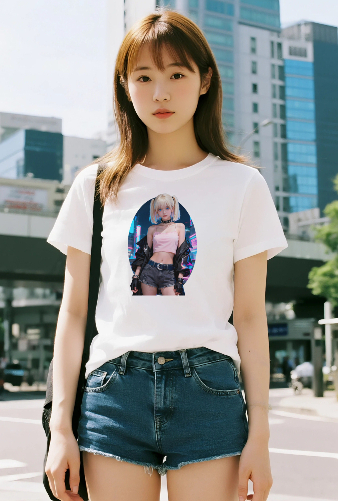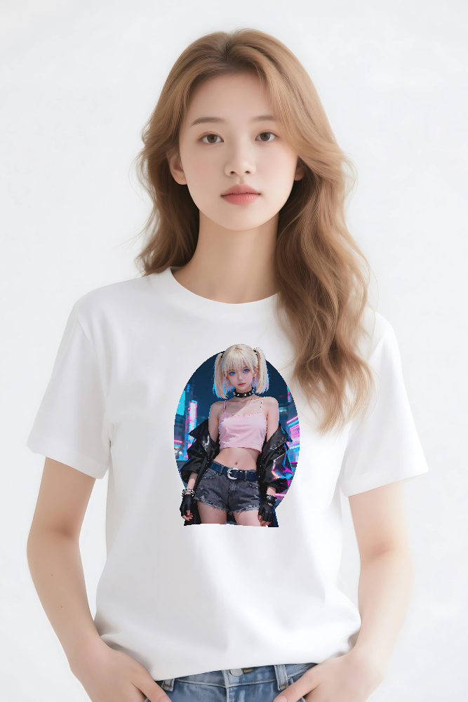 ネオンが煌めく近未来の夜景を背景に佇む、クールでセクシーなオリジナルキャラクターを大胆にプリントしたデザインです。 ブリーチされたブロンドのツインテールと吸い込まれるような青い瞳が印象的な彼女は、チョーカーやライダースジャケット、ダメージショートパンツといったストリートファッションの要素を完璧に着こなしています。 このデザインは、サイバーパンクの世界観と日本のアニメ・イラストレーションの美意識が融合した、唯一無二のアートピースです。