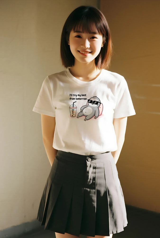 ああ、また言っちゃった…「明日から本気出す」。そう心の中でつぶやきながら、結局今日もだらけて過ごしてしまったあなたへ。このTシャツは、そんな「いつまで経ってもやる気を出せないダメ人間」を自虐的に、でもどこか愛らしく表現した、共感度120%のナマケモノTシャツです。