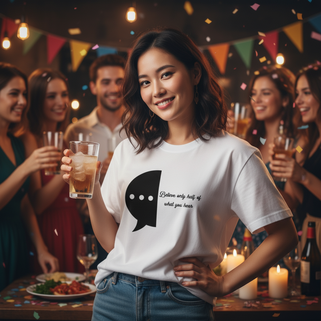 「話半分(Believe only half of what you hear)」をデザインしました。「話半分」とは"面白い話には嘘や誇張が含まれているから半分くらいに割引いて聞いておけばちょうどよい"という意味のことわざです。どんな話も話半分くらいの気持ちで聞いておけば、気が楽かもしれませんね。