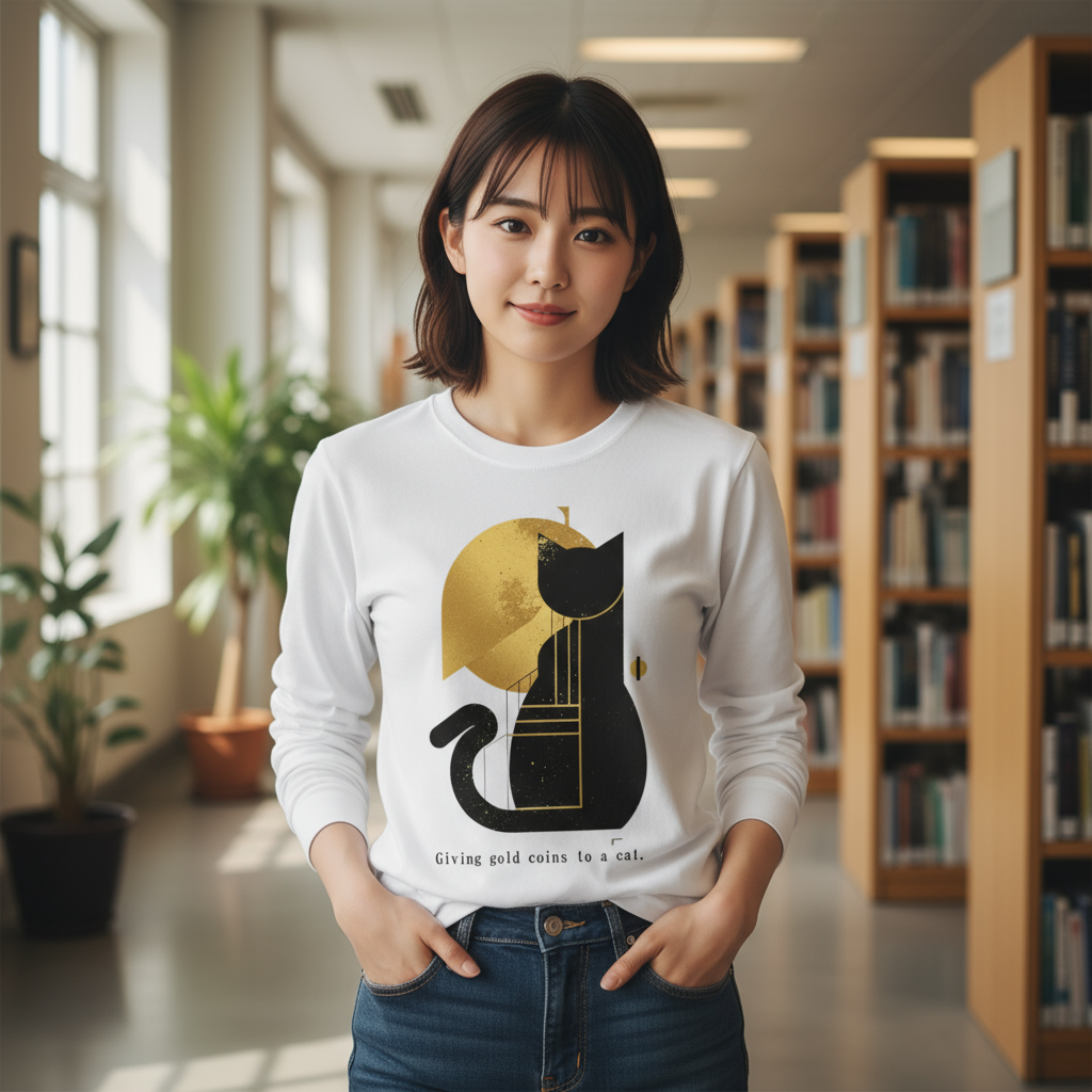 [ロングTシャツ] Giving gold coins to a cat.