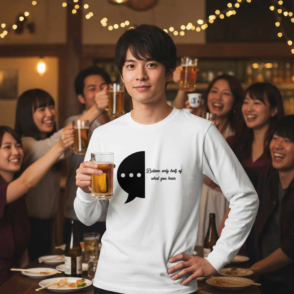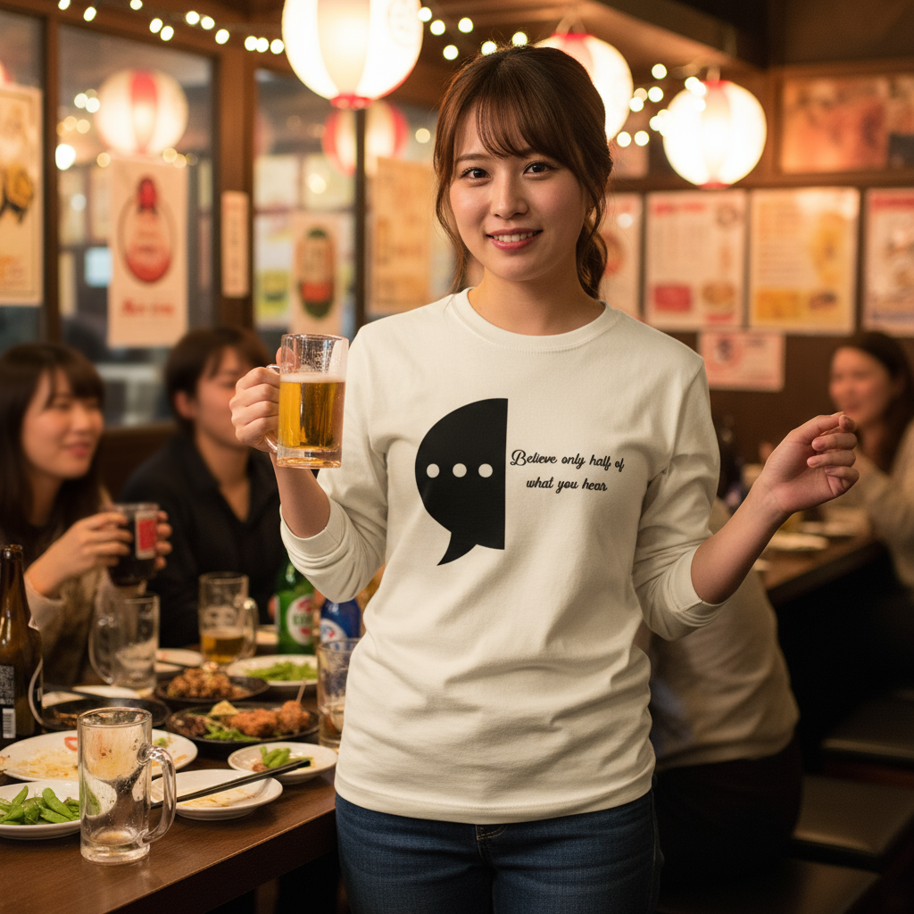 「話半分(Believe only half of what you hear)」をデザインしました。「話半分」とは"面白い話には嘘や誇張が含まれているから半分くらいに割引いて聞いておけばちょうどよい"という意味のことわざです。どんな話も話半分くらいの気持ちで聞いておけば、気が楽かもしれませんね。