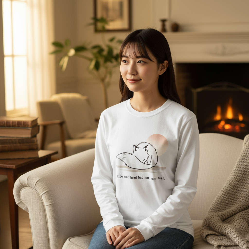 「頭隠して尻隠さず(Hide your head but not your tail.)」をかわいらしいキツネでデザインしました。「頭隠して尻隠さず」は"欠点などの一部分だけを隠し、全体を隠したつもりでいること"を意味することわざです。隠し事をしないに越したことはありませんが、する場合は「頭隠して尻隠さず」なんてことにならないようにしましょう。
