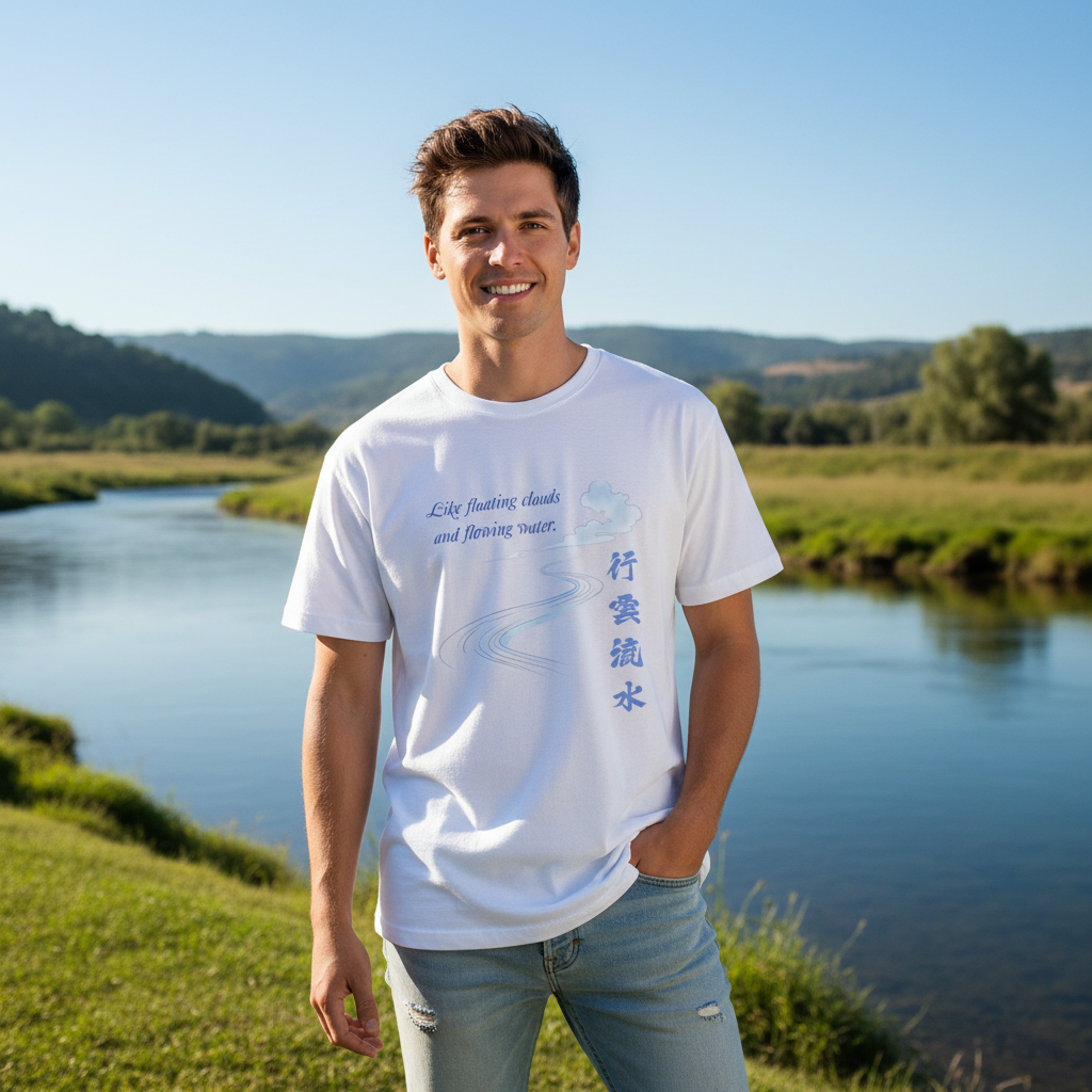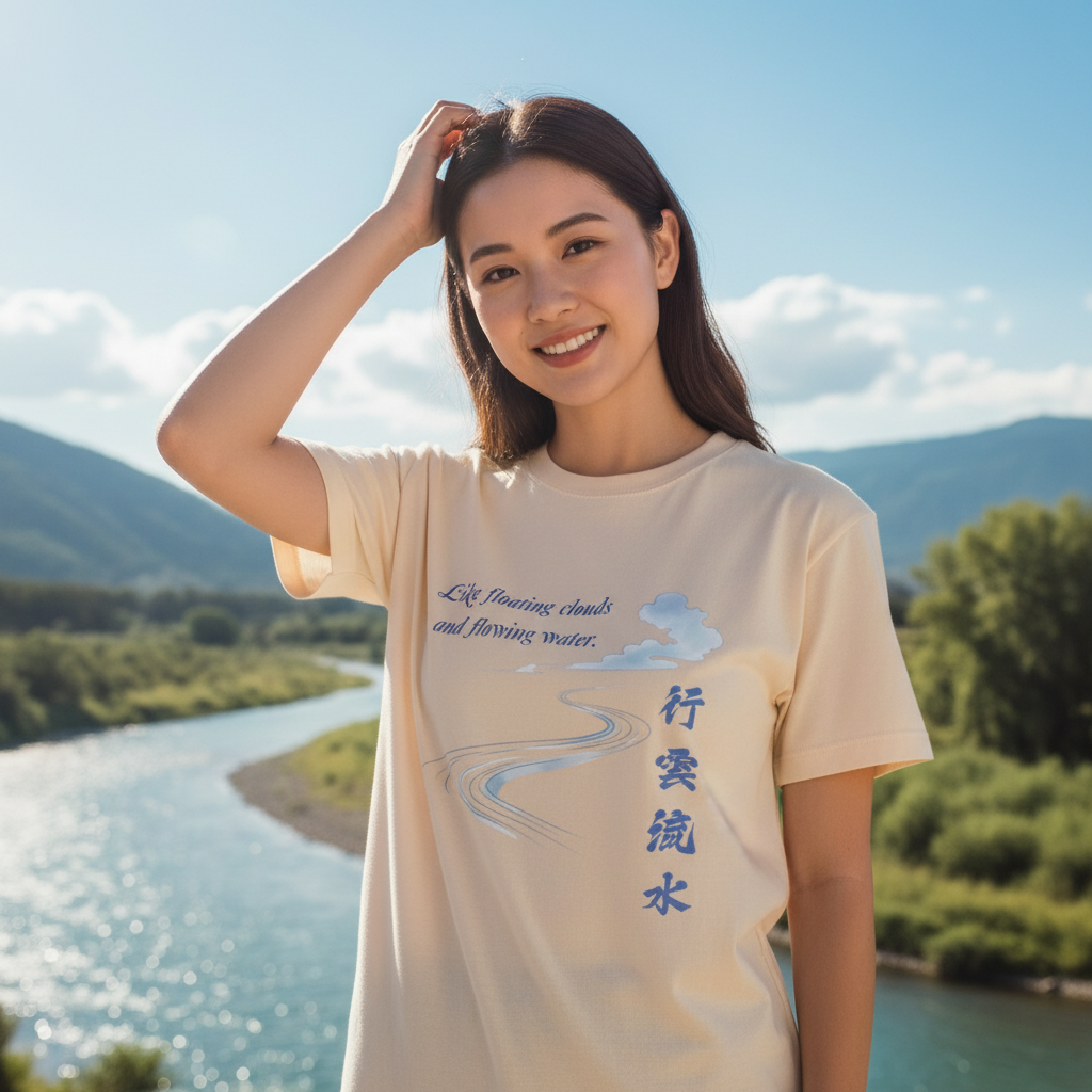 「行雲流水(Like floating clouds and flowing water.)」を和風にデザインしました。「行雲流水」は"空を行く雲や流れる水のように、物事にこだわらず、自然の成り行きに任せて行動すること"を意味する熟語です。こんな風に生きていくのも人生の選択肢の1つですね。