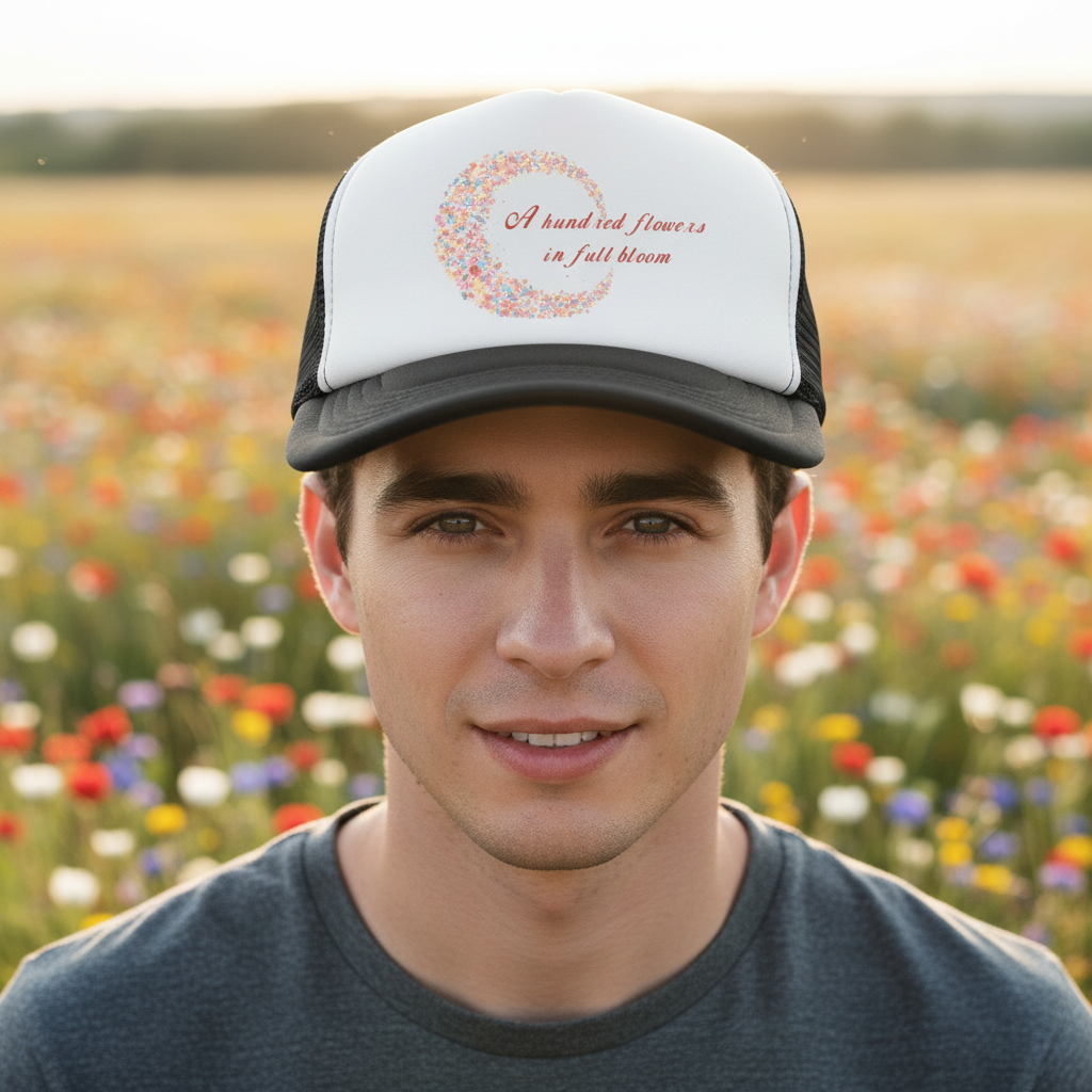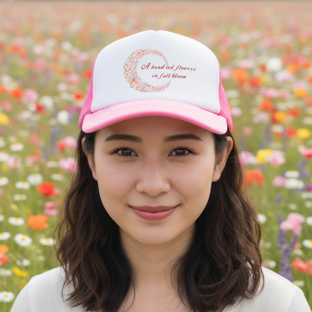 「百花繚乱(A hundred flowers in full bloom)」を色とりどりの花々でデザインしました。「百花繚乱」は"たくさんの優れたものや人が、いっせいに目立って活躍すること"を意味することわざです。自分も頑張って百ある花の1つになりたいですね。