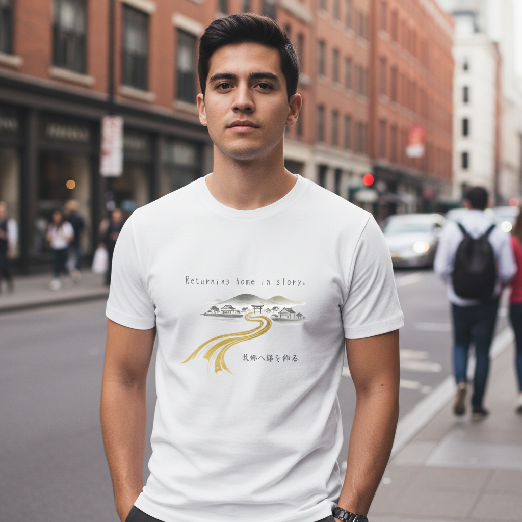 「故郷に錦を飾る(Returning home in glory.)」を和風にデザインしました。「故郷に錦を飾る」は"自分の成功や立派な成果を故郷の人々に見せること"を意味することわざです。"錦"とは"高級で美しい絹織物"のことです。いつか我々も故郷に錦を飾りたいものですね。