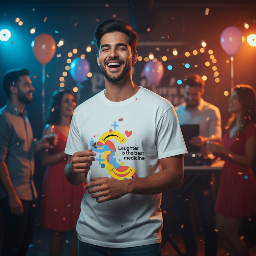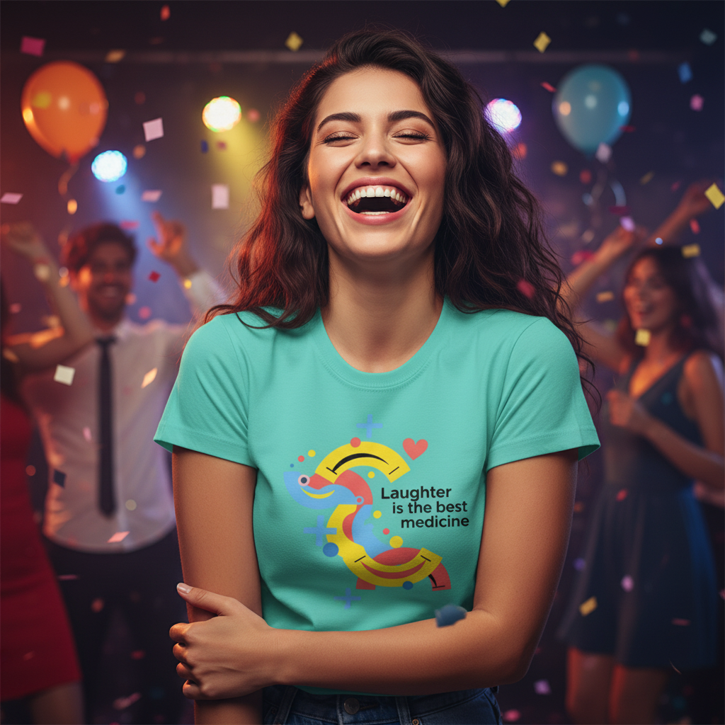 「笑いは人の薬(Laughter is the best medicine.)」を楽し気なイメージでデザインしました。「笑いは人の薬」は"笑うことは心身の健康に良い影響を与える"を意味することわざです。笑うことで心身の健康を保ちたいものですね。